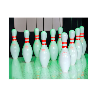 ボウリングピン の 形 は,普通 の 花瓶 と 同じ よう に,下部 は 厚い,上部 は 薄い.その 高さ は 通常 38 センチ から 38.85 センチ まで です.厚い部分は直径約12cm~12cm.1センチメートル,底径は約5.02センチメートルから6センチメートルである.これらの寸法により,ピンは配置されたときに安定した三角形構造を形成する.